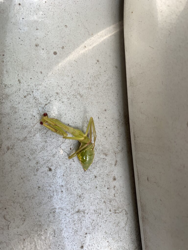 今天我在爸爸车的后备箱发现了一只螳螂,但是很可惜,它已经死了